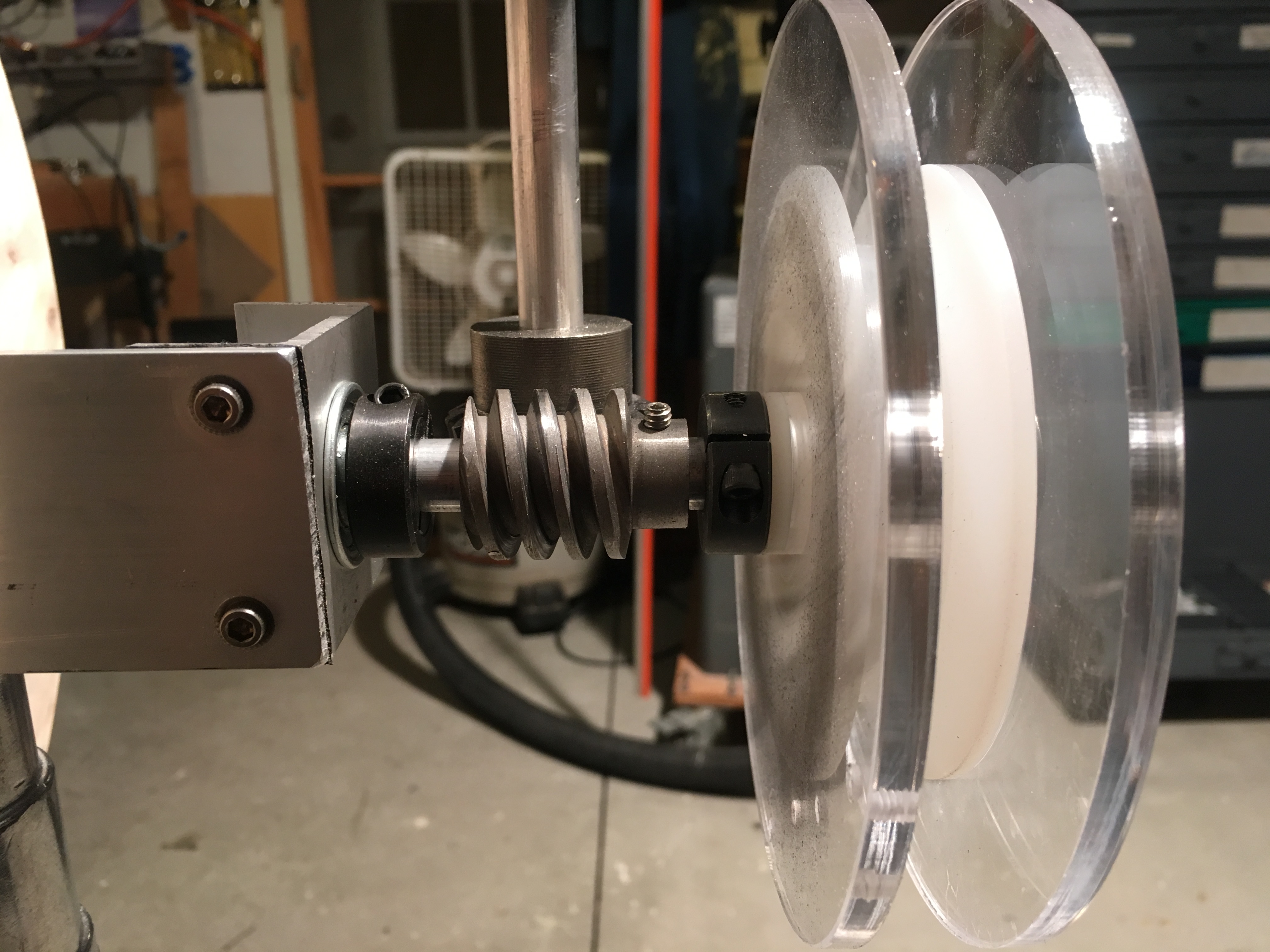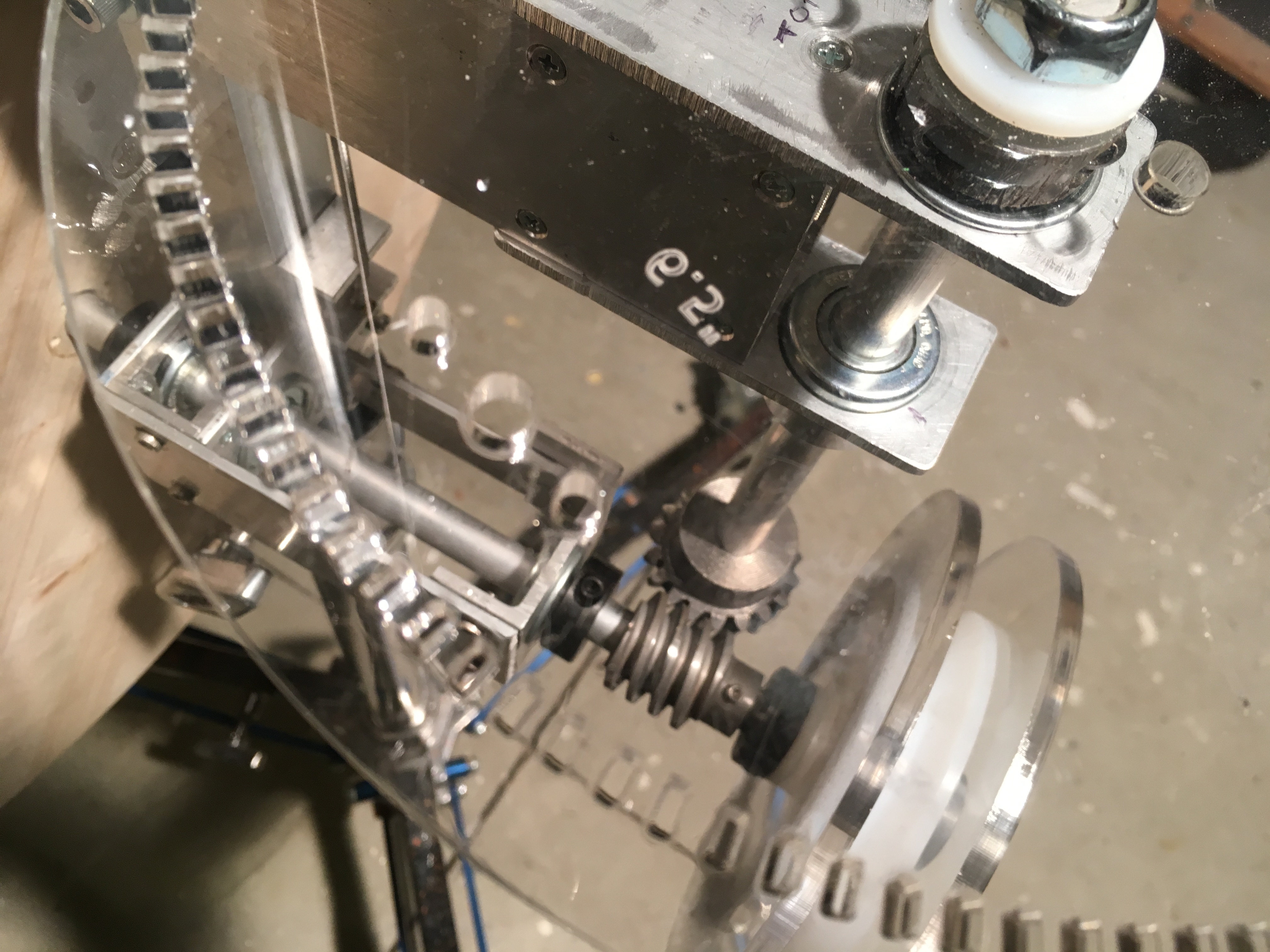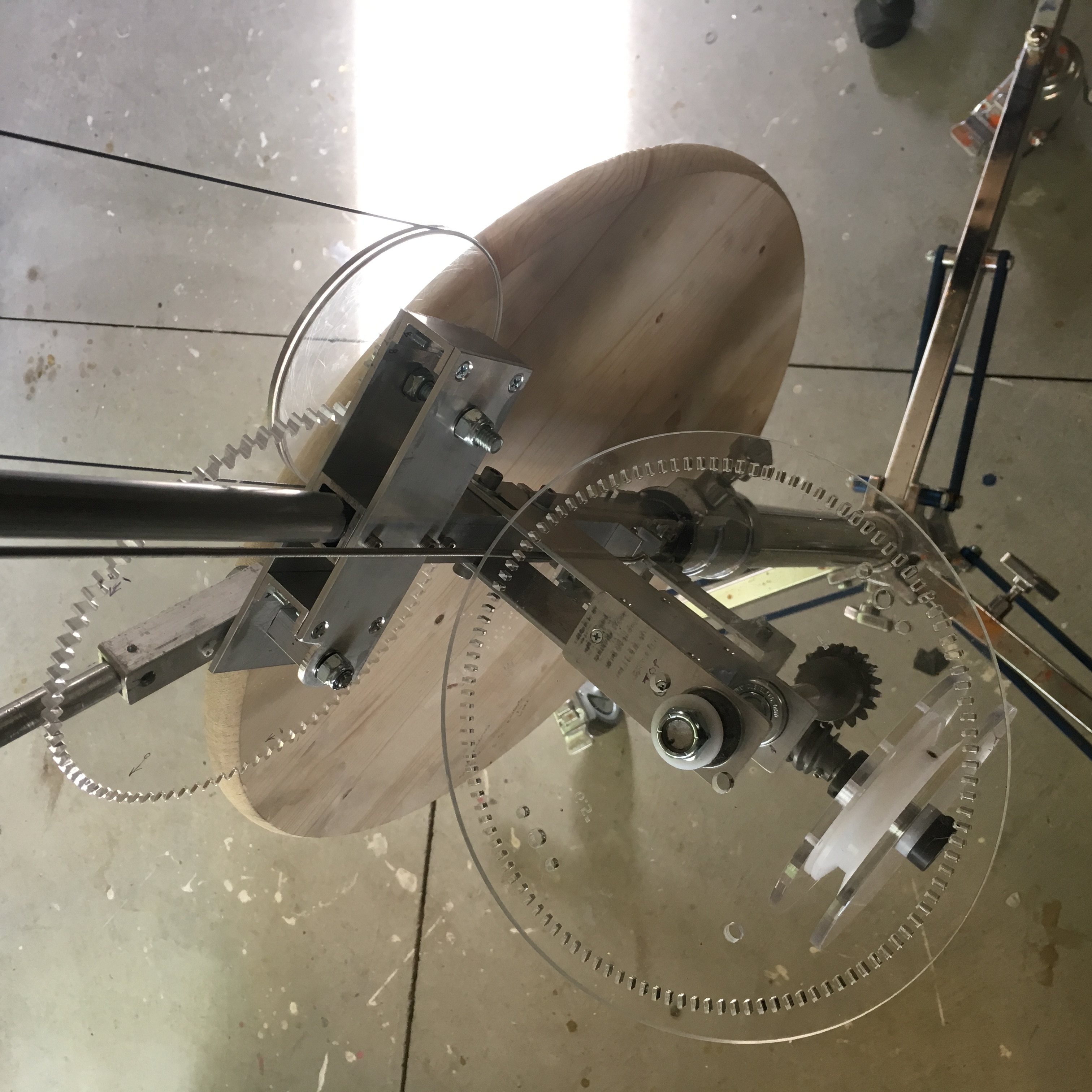 SOLUTION: A single bass string that is “bowed”, but borrowing from a hurdy gurdy mechanism where the bow is a revolving disc with rosin on it. There is a weighted flywheel and worm gear mechanism that keeps the disc turning. The mechanics are designed to require the performer to look as though they are making a bowing motion as a cellist would when really they are winding up a flywheel.