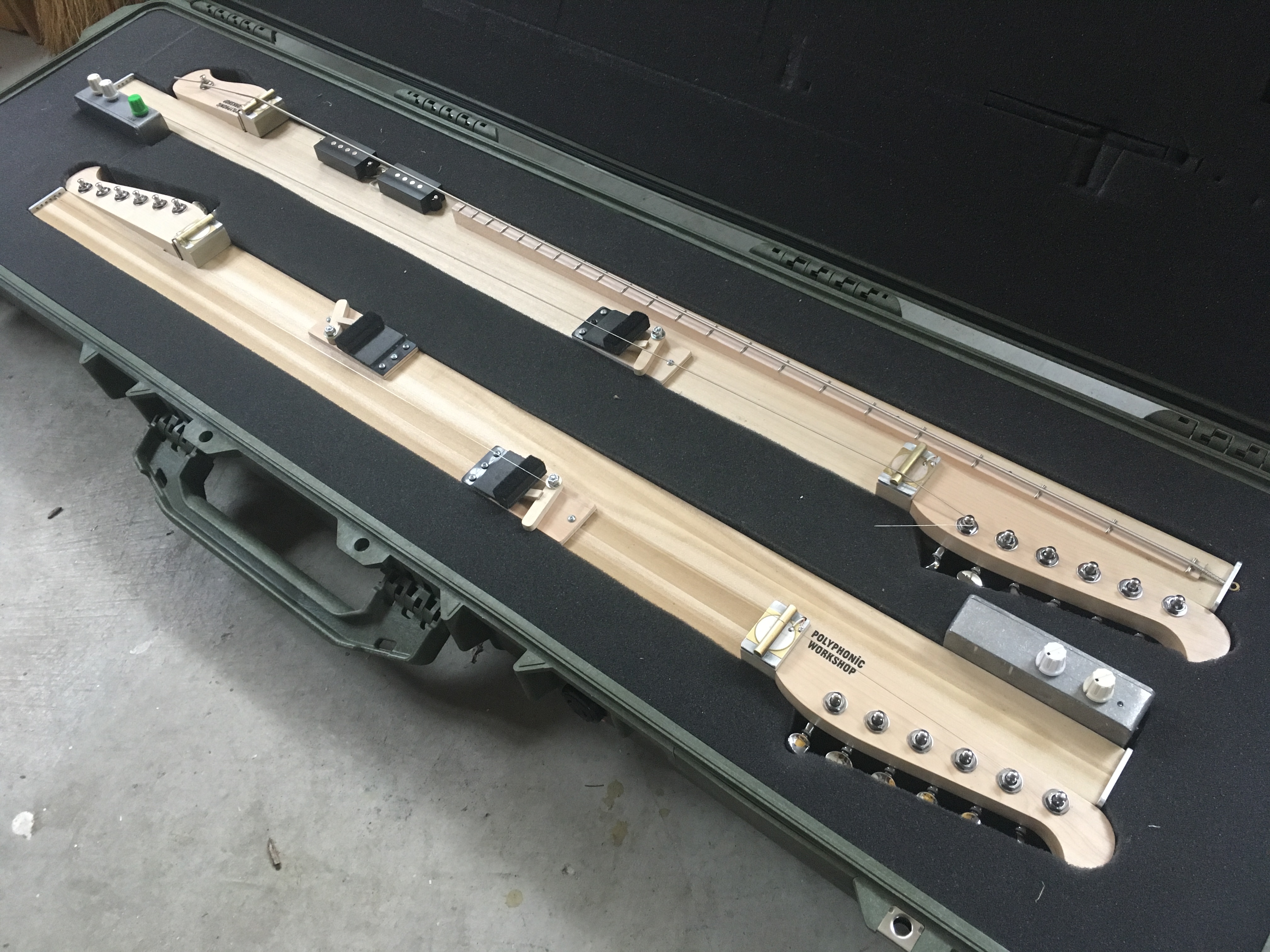 SOLUTION: Using a minimalist approach, a body shape just large enough to accommodate two sets of 12 strings that mirror each other. The performer can play each side of the instrument with sticks similar to a hammered dulcimer. There are mechanical mutes that can be engaged for tonal changes. A unique piezo bridge and preamp electronics was utilized for amplification while still retaining the acoustical qualities of the wood. They travel paired up in Pelican rifle cases. Several iterations of these have been commissioned since 2012 as the composition continues to be performed by different ensembles around the world.